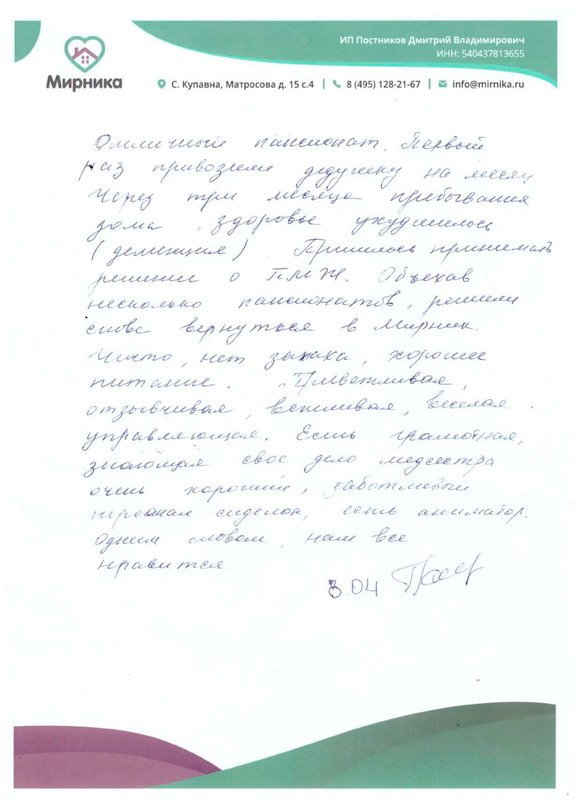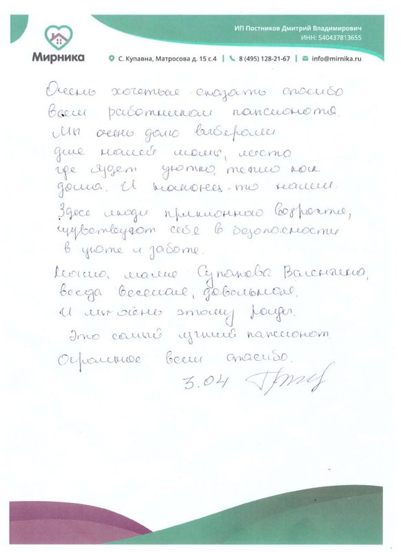 Приятный дизайн помещений, комплексное питание и безупречная работа персонала - покупая путевку в пансионат для пожилых людей Мирника, вы позволяете себе не только снизить уровень стресса, но и восстановить здоровье, ведь хорошее настроение - залог хорошего самочувствия!